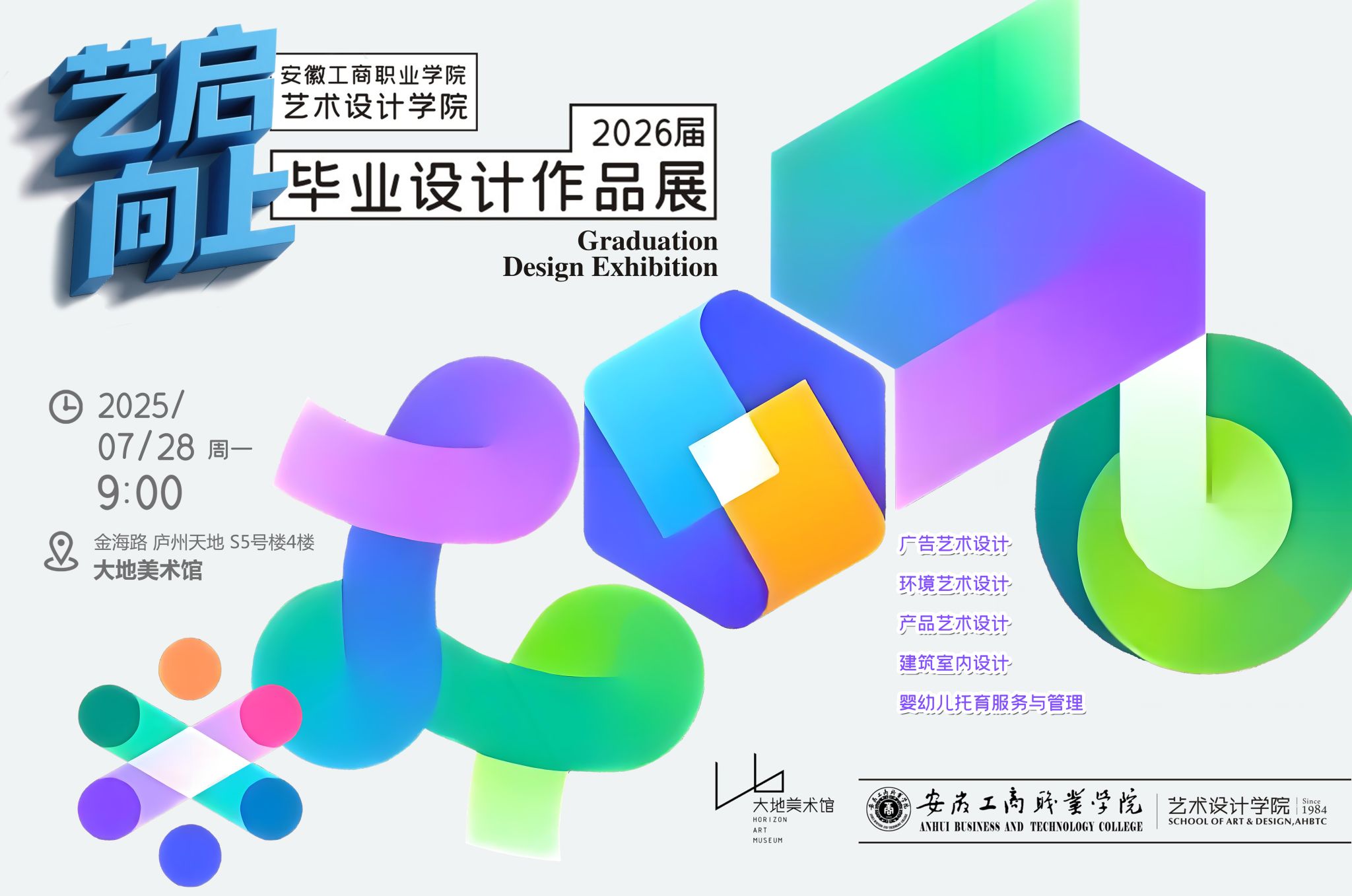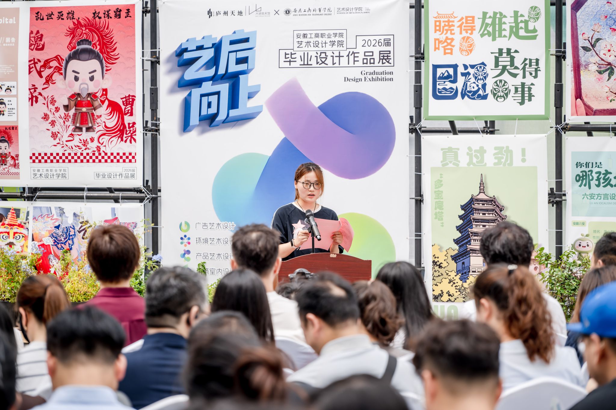 7月28日上午,由必赢766net手机版必赢766net手机版与金大地庐州天地联合主办的“2026届必赢766net手机版毕业设计作品展”在庐州天地文化街区大地美术馆隆重开幕。本届毕业设计作品展以“专业深耕·社会关怀”为核心主题,汇聚了广告艺术设计、环境艺术设计、产品艺术设计、建筑室内设计、婴幼儿托育服务与管理五个专业281组原创设计作品。必赢766net手机版党委委员、党委宣传统战部部长、必赢766net手机版党总支书记孔成,必赢766net手机版党总支副书记、院长魏芬,副书记张乐,副院长邱志斌,安徽省工艺美术大师马业长,双凤管委会宣传办主任吴开平,双凤经开区峰宁社区党总支书记刘爽,金大地庐州天地项目总经理武骏,安徽财经大学环艺研究中心主任杨剑,农业农村部小岗村培训基地执行主任雷松林等嘉宾出席,必赢766net手机版2026届毕业设计指导教师及281名毕业生共同参加了开幕式。