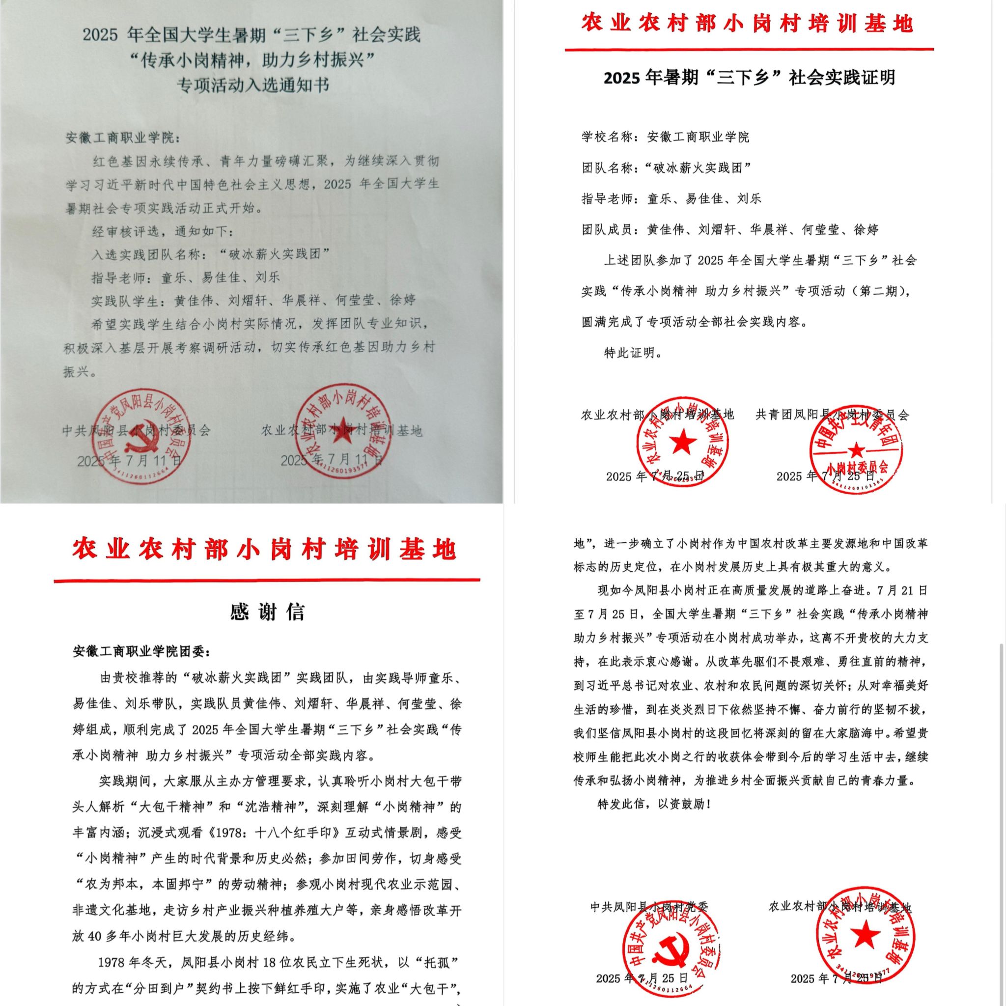 七月热土,绿浪翻涌改革源;青春潮涌,希望奔流田野间。7月21日至25日,我校“破冰薪火实践团”成功入选并参与了2025年全国大学生暑期“三下乡”社会实践“传承小岗精神 助力乡村振兴”专项活动。由校团委副书记童乐、团委老师刘乐、易佳佳带队,我校实践团队满怀热忱,奔赴“中国农村改革发源地”——安徽凤阳小岗村,开展了为期五天的沉浸式社会实践活动。团队成员紧密结合小岗村发展实际,充分发挥专业所学,深入基层一线,通过理论学习、实地调研、劳动体验、产业考察、直播赋能等多种形式,全方位、多角度感悟改革历程,探寻振兴密码。