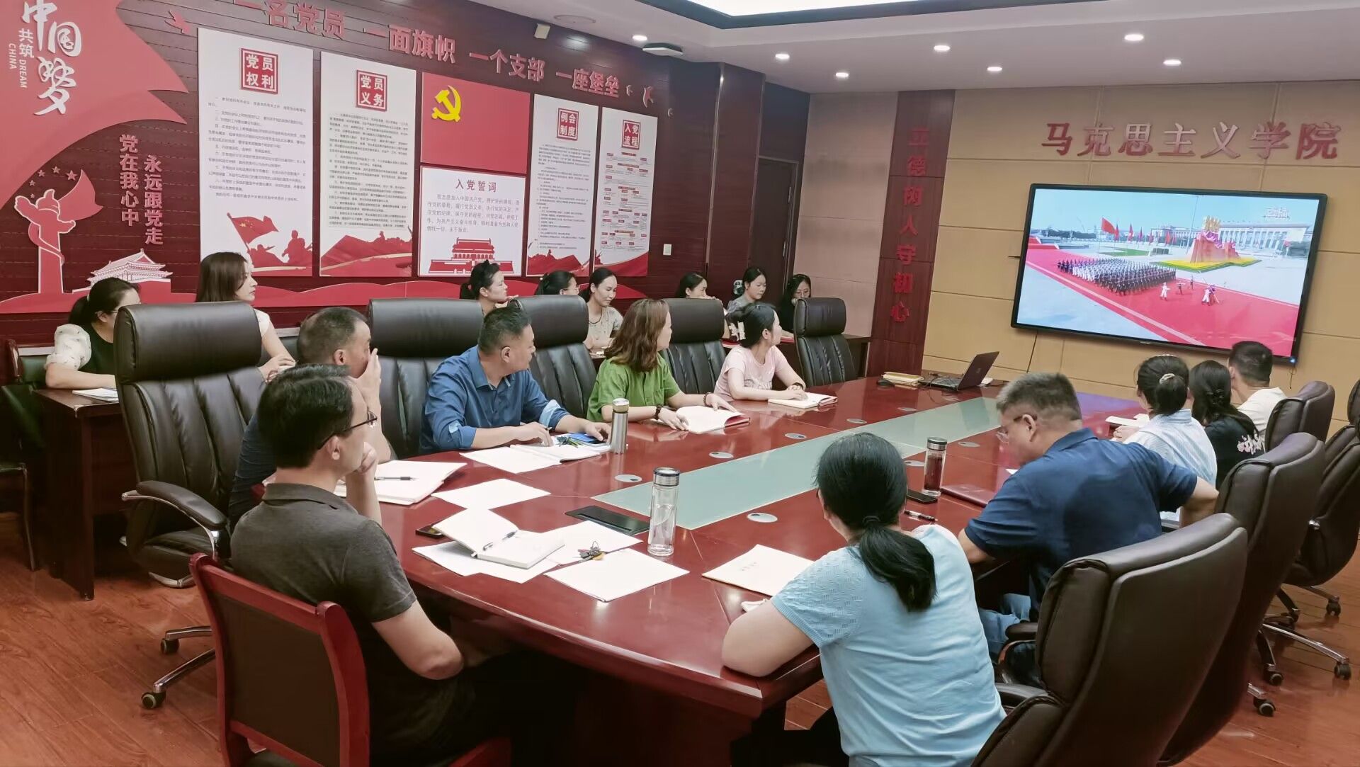 马克思主义学院全体思政课教师齐聚党员活动室。屏幕上,受阅方阵步伐铿锵,新型装备气势磅礴,大家心潮澎湃、豪情激荡。纷纷表示,要将伟大的抗战精神深度融入课堂教学,切实肩负起铸魂育人的时代使命。