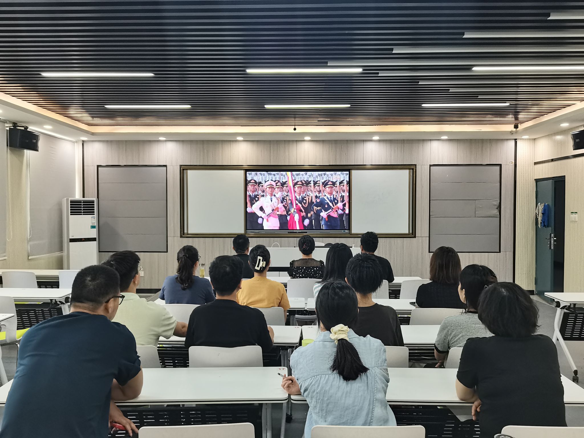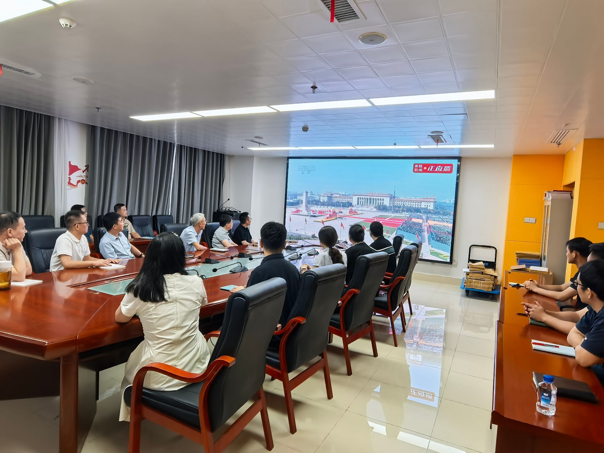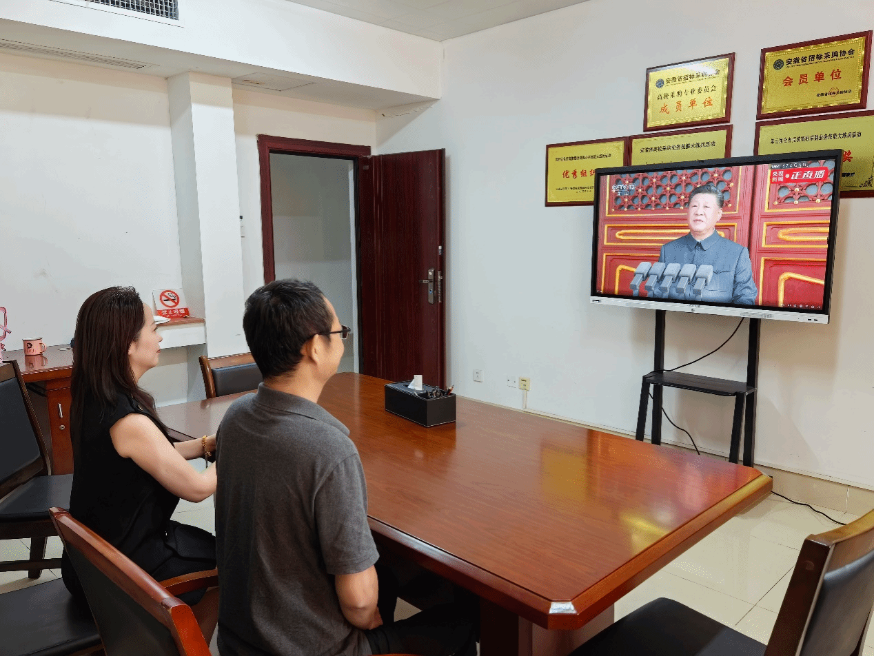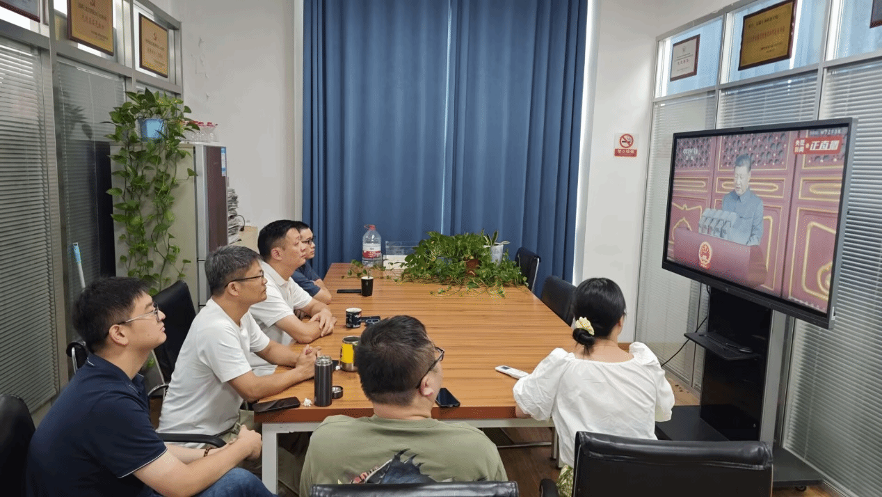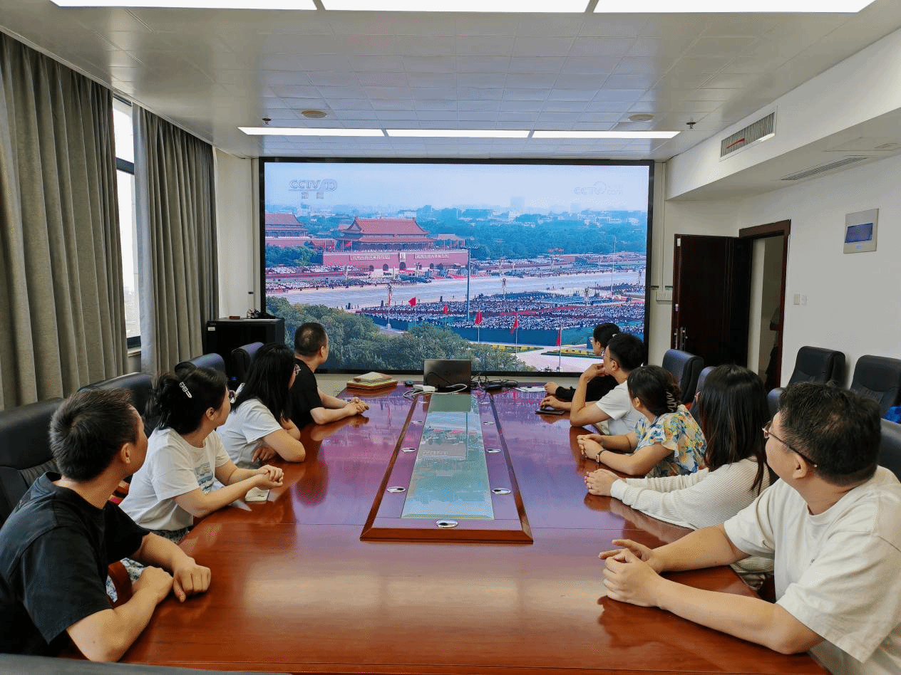组织人事处全体成员提前就座,阅兵式开始,同志们目光专注坚定,凝神注视着屏幕中一个个威武雄壮的方阵和一件件彰显国家实力的先进装备,心中涌动着对祖国强盛的由衷自豪与对历史的深刻感悟。