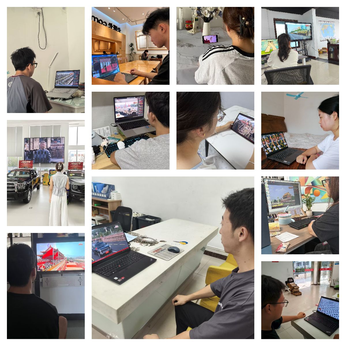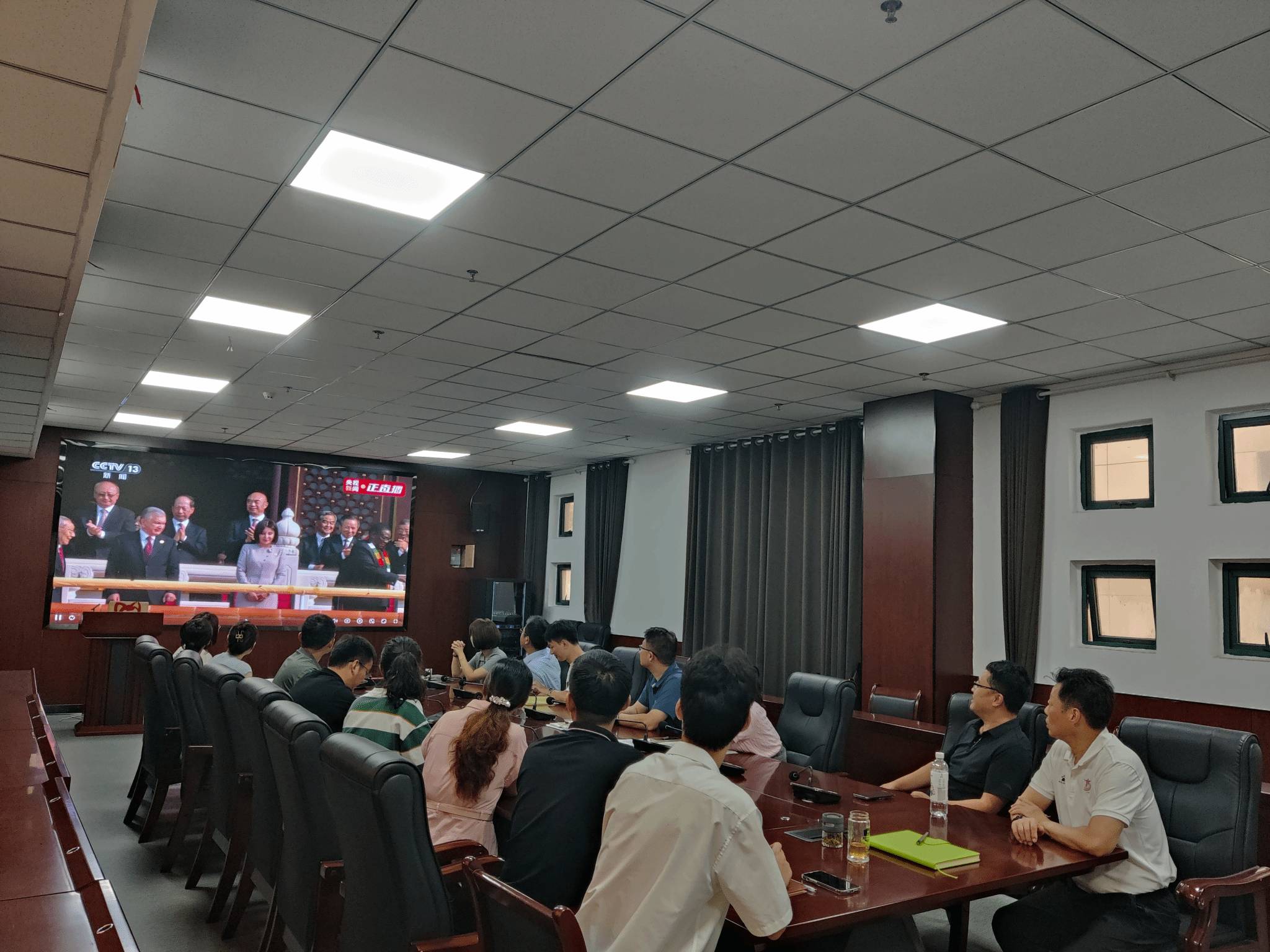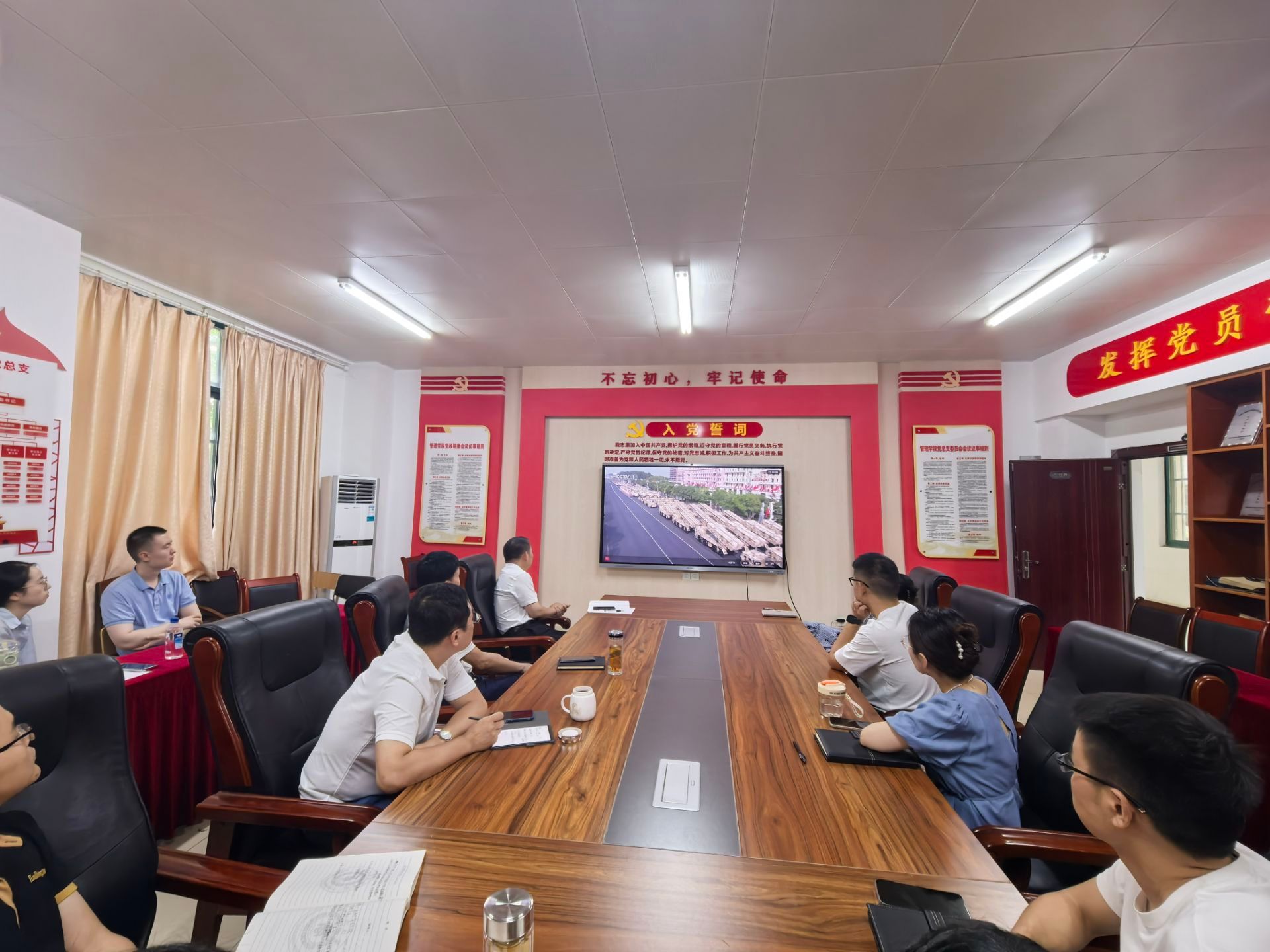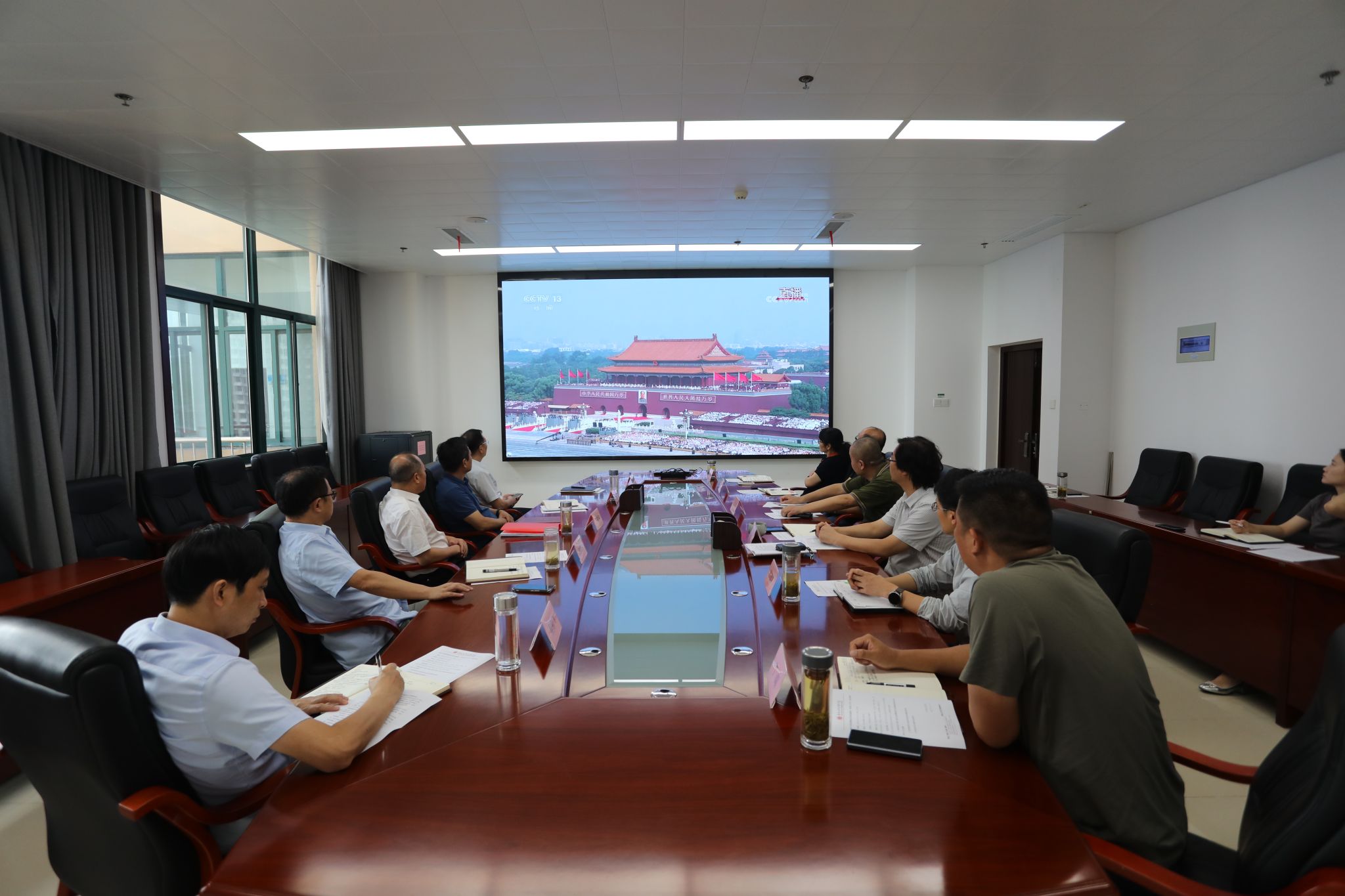 组织人事处全体成员提前就座,阅兵式开始,同志们目光专注坚定,凝神注视着屏幕中一个个威武雄壮的方阵和一件件彰显国家实力的先进装备,心中涌动着对祖国强盛的由衷自豪与对历史的深刻感悟。