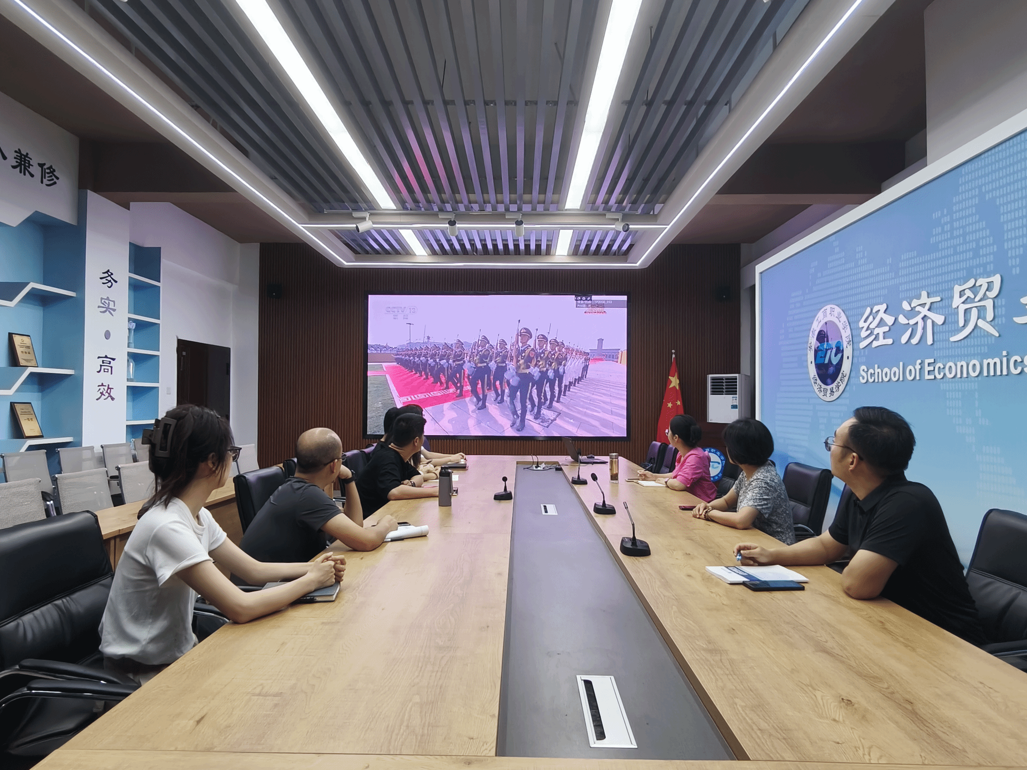 经济贸易学院组织在校教师在学院会议室集中观看大会直播,大家心潮澎湃,内心无比自豪!纷纷表示要牢记为党育人、为国育才的初心使命,要将伟大抗战精神融入育人过程,将阅兵激发的爱国热情转化为育人动力,培养更多具有家国情怀和专业本领的高素质技术人才。