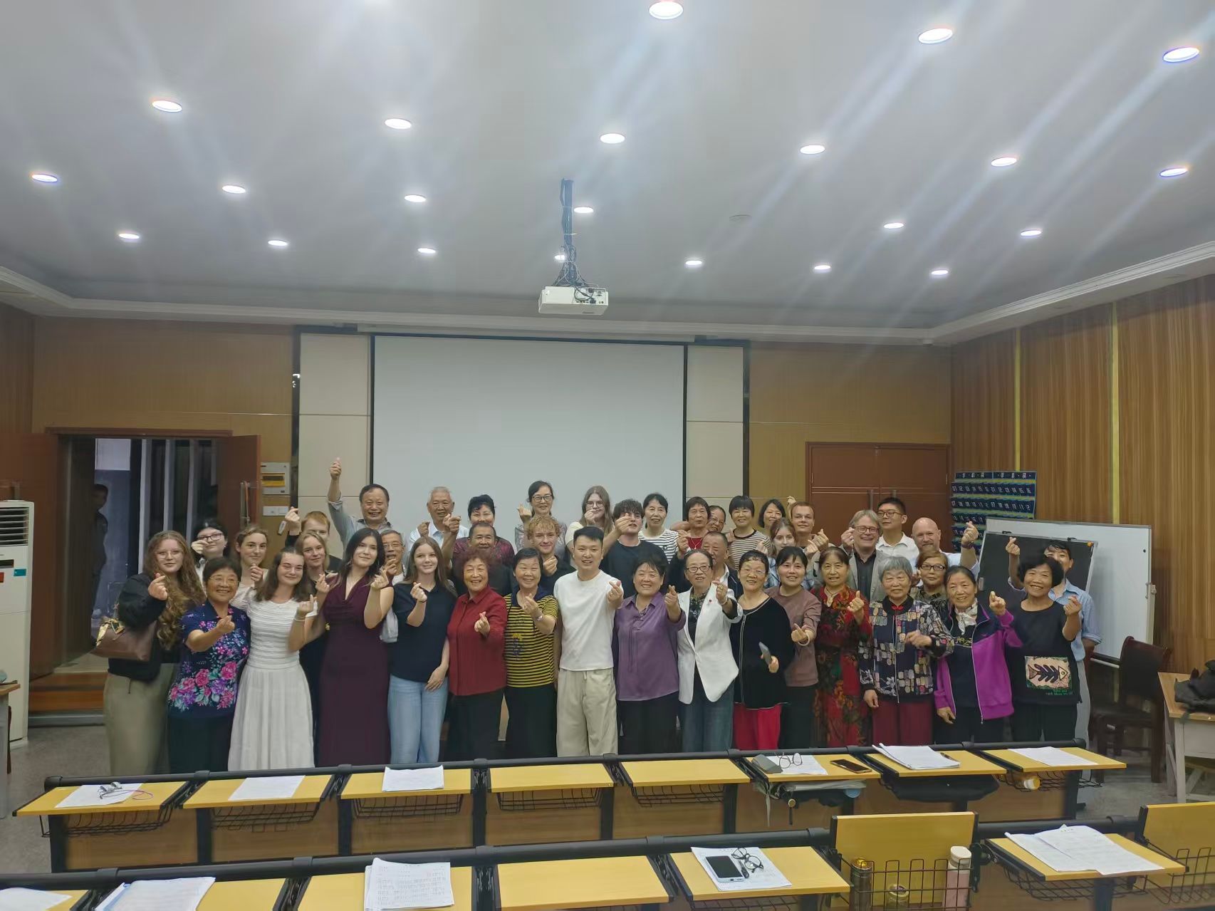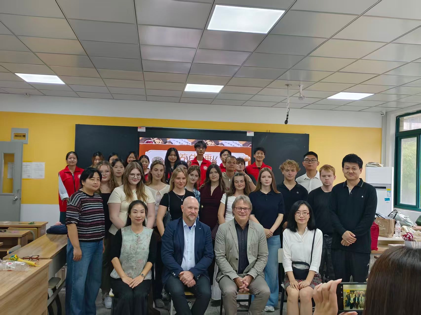 在欢迎座谈会上,德国学生现场集体演唱了中文歌曲《月亮代表我的心》。我校信息工程学院的杭梅老师详细介绍了我校师生精心准备的赠礼,并播放了相关制作视频。该赠礼是由学院师生共同设计制作的,具有浓郁中国特色的文创作品。随后,双方互赠礼物,并进行了热烈的交流。