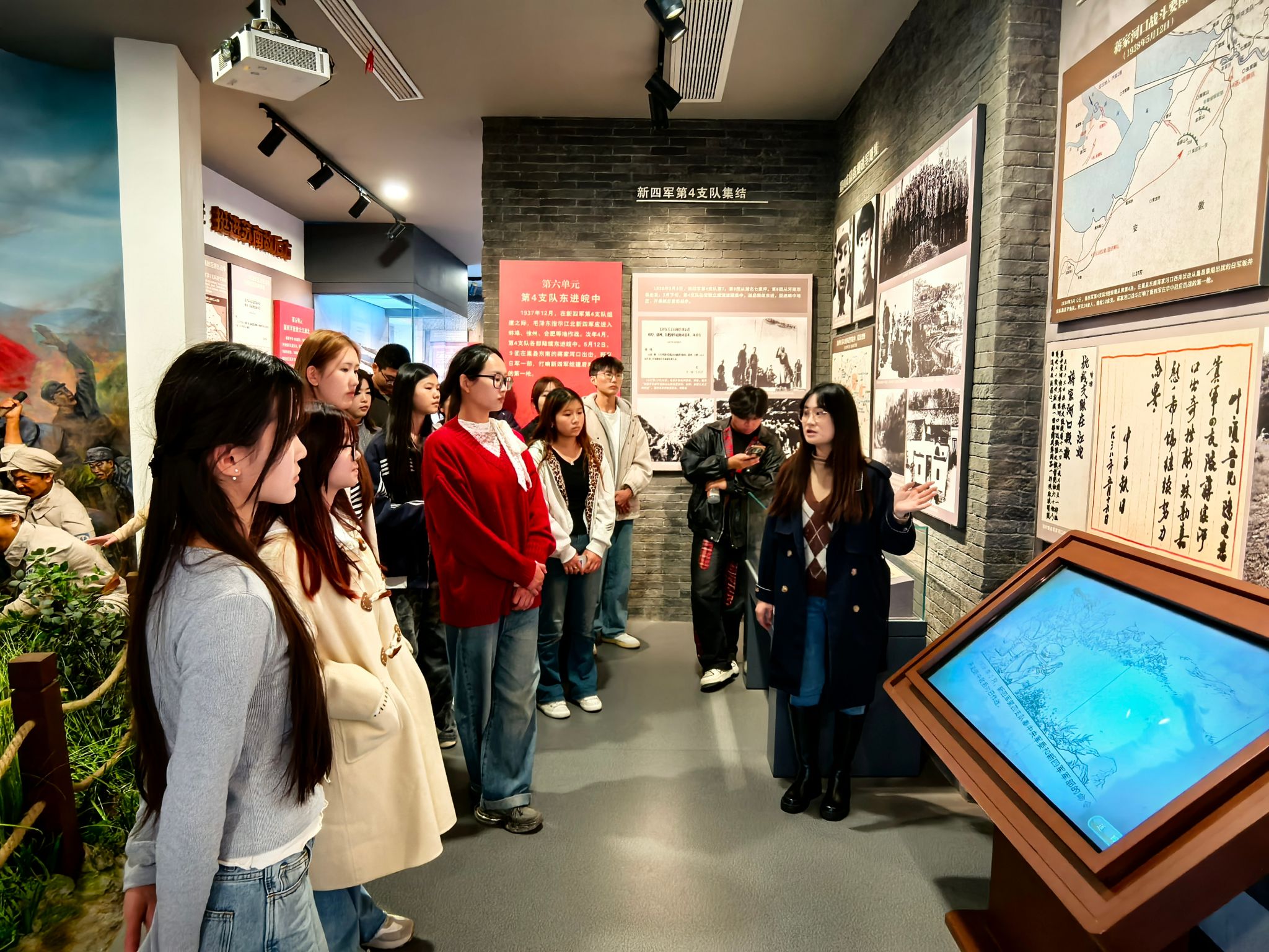 追寻红色足迹,历史在现场“活”起来。在气势恢宏的渡江战役纪念馆内,同学们通过观看丰富的实物、影像和历史资料,深刻感受到了“钟山风雨起苍黄,百万雄师过大江”的壮阔场景与革命先烈们不畏牺牲、勇往直前的英雄气概。巨大的战役浮雕、珍贵的文物展品以及模拟当年的作战地形图,无一不让同学们驻足沉思,仿佛将大家带回了那个波澜壮阔的革命年代。在新四军江北指挥部旧址,大家身临其境地追忆了那段铁血抗战的烽火岁月,体悟了新四军将士矢志不渝、不怕牺牲的铁军精神。历史的厚重感扑面而来,让书本上的知识变得可感可触。