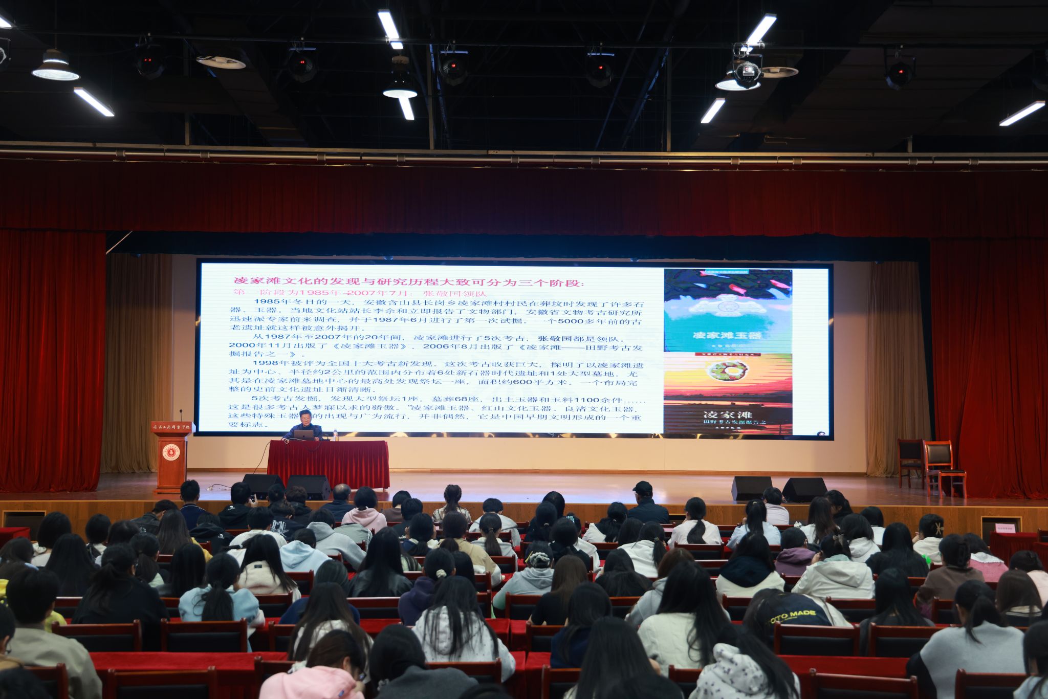 为弘扬中华优秀传统文化,稳步推进文化育人工作,提升师生人文素养,增强文化自信,11月5日下午,第五十五期工商大讲堂在双凤校区大学生活动中心开讲。本期大讲堂以“凌家滩文化:长江流域文明的先锋”为主题,特邀安徽省人民政府文史馆馆员、安徽省文物考古研究所研究员、凌家滩考古队首任领队张敬国老师担任主讲嘉宾。现场吸引了500余名师生踊跃参与。本次讲堂由校党委委员、党委宣传统战部部长孔成担任学术主持。