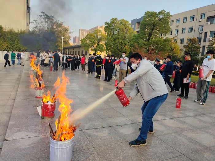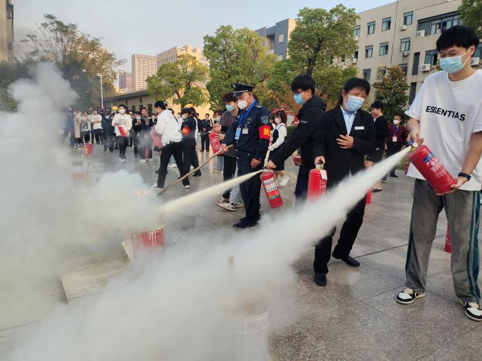 长丰县消防救援大队教官向参会人员详细介绍了防毒面具和灭火毯的使用方法并进行了演示,讲解了二氧化碳灭火器和干粉灭火器的区别及使用注意事项。邀请活动现场师生员工亲手使用灭火器对火点进行扑灭操作演练,从而掌握灭火技能,增强现实体验感。