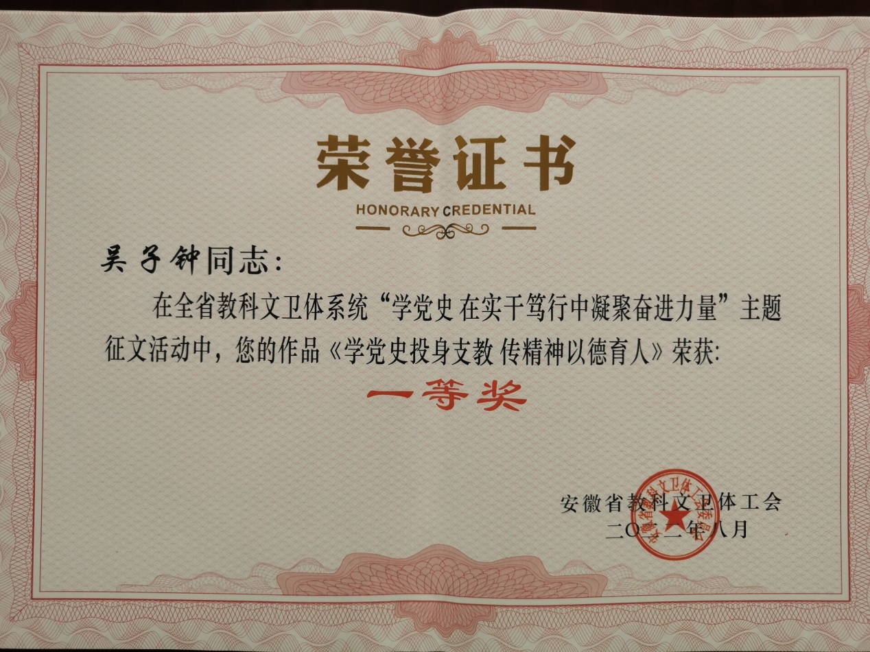 校工会高度重视,会同党委宣传统战部、马克思主义学院在校内组织了“学党史,在实干笃行中凝聚奋进力量”主题征文征集评选活动活动,并按要求推选出8篇征文参加省教科文卫体系统“学党史,在实干笃行中凝聚奋进力量”主题征文活动,经过评审,我校吴子钟老师的《学党史投身支教,传精神以德育人》的作品荣获一等奖,余想花、文珂、杨丽娟、宋静娴等老师获优秀奖,校工会获优秀组织单位奖。