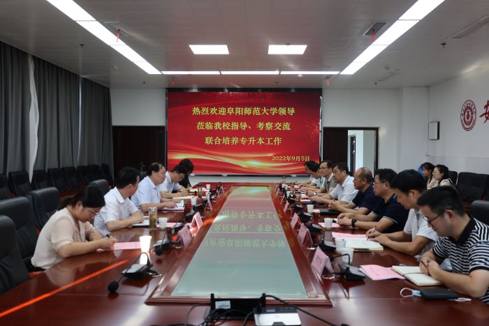 汪芳启对我校为联合培养专升本工作的精心准备和细心考虑给予了高度的评价。他指导了我校的联合培养工作,同时希望双方在招生录取、教育教学、学生管理、就业与考研服务等方面进一步深化交流合作,把学生迎接好、管理好、培养好,共同完成好社会、学校和学生家长交付我们的职责和使命。他表示阜阳师范大学将扛起联合培养主体责任,全过程、全方位参与人才培养、教育教学和学生管理工作,注重沟通、把握细节,将此项工作制度化、标准化,形成联合培养长效机制。