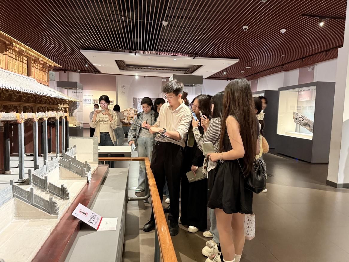 师生重点参观了“徽州古建筑”展厅,从徽州古建筑 “依山傍水” 的选址布局,到 “四水归堂” 天井的实用功能,再到木雕、石雕、砖雕装饰的文化寓意,结合建筑专业知识,同学们深刻了解其中设计逻辑,为后续调研报告和手绘参照积累素材。
