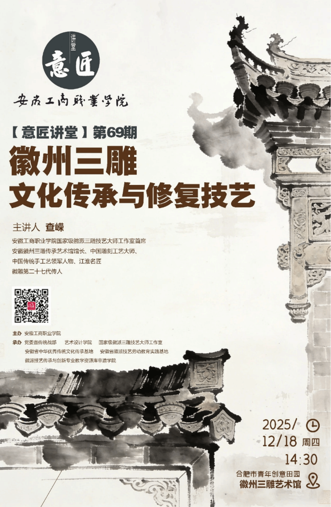 2025年12月18日下午,必赢766net手机版第六十九期“意匠讲堂”在合肥·青年创意田园徽州三雕艺术馆拉开帷幕。本期特邀学院徽派三雕技艺大师工作室首席、徽州三雕传承艺术馆馆长、中国雕刻工艺大师、江淮名匠、徽雕第二十七代传人查嵘先生担任主讲。必赢766net手机版院长魏芬、副院长邱志斌、教务科长张翌、部分教师及2024级各班的学生代表共同参加了本次讲座。