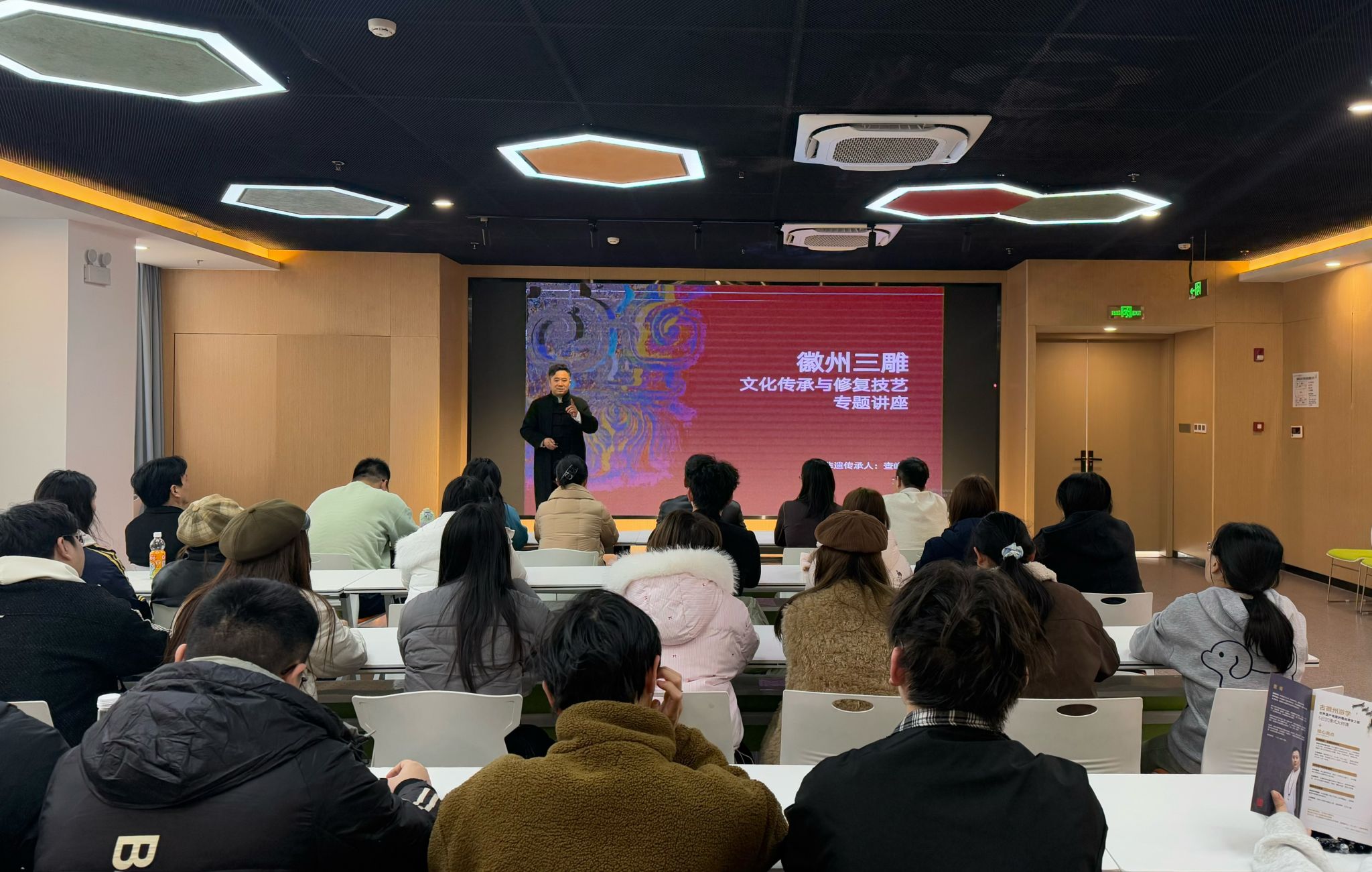 实地探访结束后,讲堂转入专题讲授环节。查嵘大师结合方才观摩的实物,系统阐述了徽州三雕的历史脉络、地域特色、核心技艺及其在古建筑修复与当代创新中的应用。他特别分享了作为传承人在技艺研习、文物保护与艺术创新中的心路历程与实践案例,深入探讨了徽派三雕在保护、传承与创新过程中面临的挑战与对策。