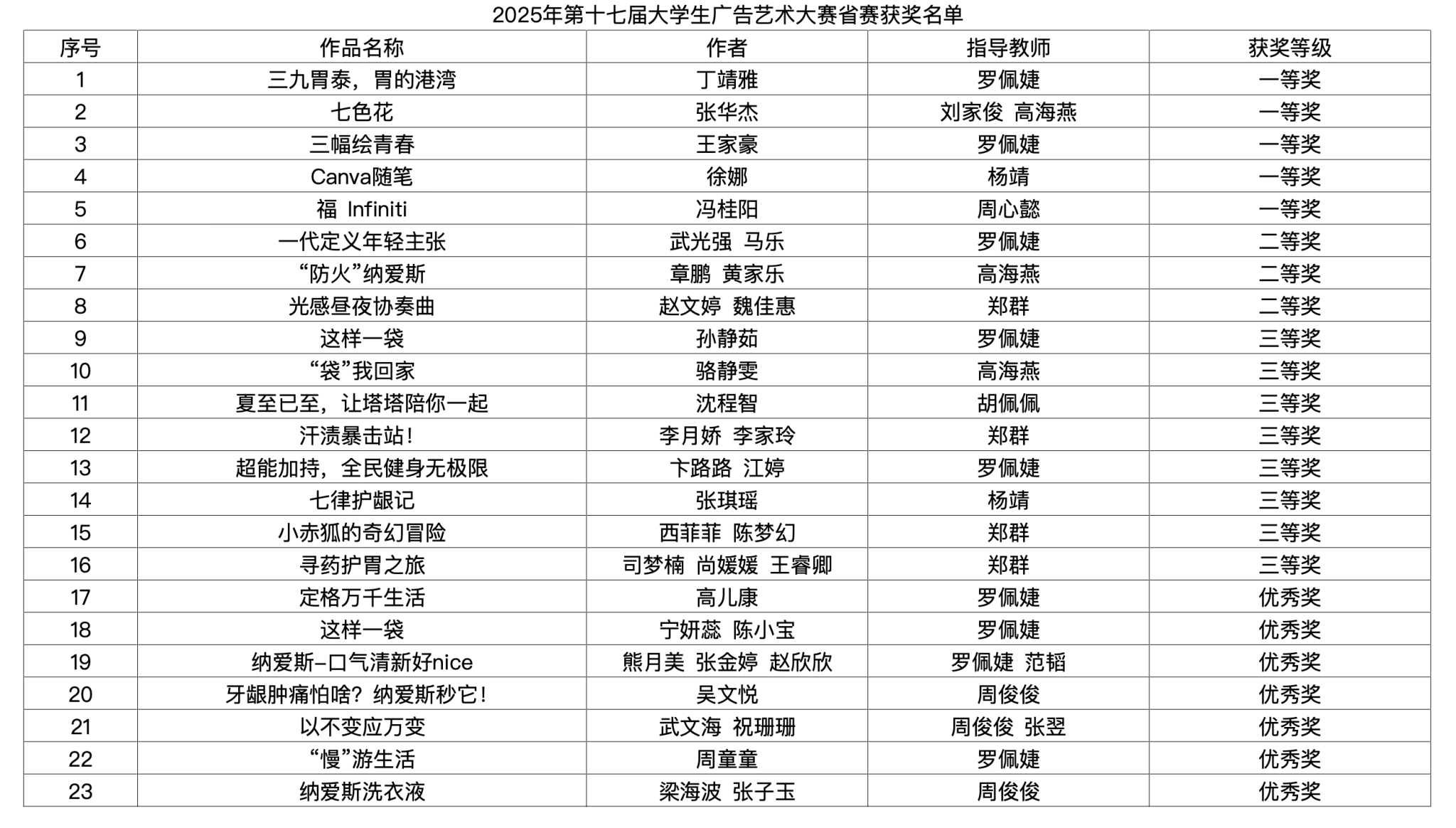 2025年第17届全国大学生广告艺术大赛中,必赢766net手机版共提交197件参赛作品进入省赛角逐,共计获得省级一等奖5项、二等奖3项、三等奖8项,优秀奖7项,其中高海燕老师指导的作品同时获得全国优秀奖1项。继续保持了必赢766net手机版在大学生广告大赛中的优异成绩。