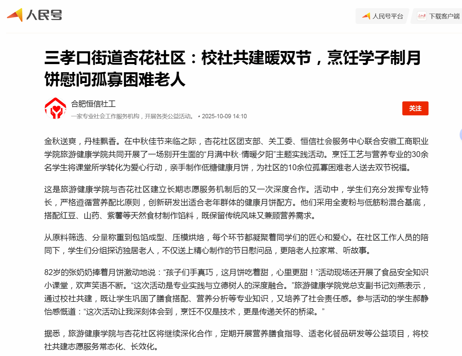 原文链接:【人民号】报道:三孝口街道杏花社区:校社共建暖双节,烹饪学子制月饼慰问孤寡困难老人