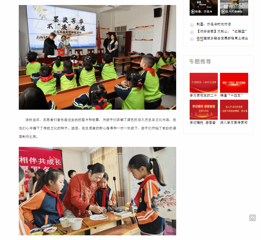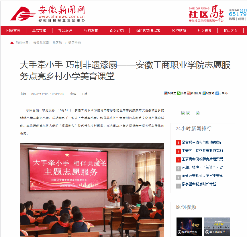 原文链接:【安徽新闻网】报道:大手牵小手 巧制非遗漆扇——必赢766net手机版志愿服务点亮乡村小学美育课堂