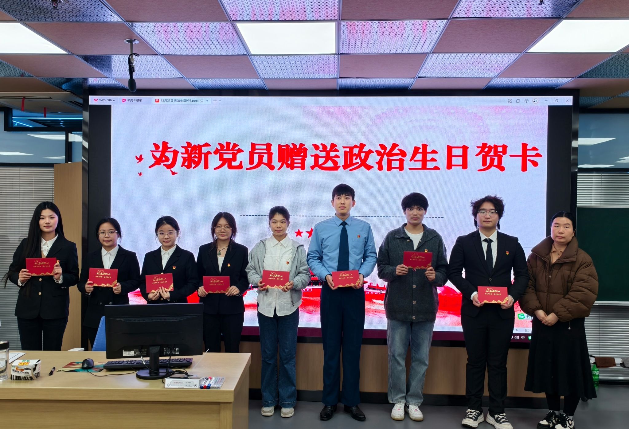 活动尾声,各学生党支部书记为党员赠送政治生日贺卡,传递组织的关怀与嘱托。全体党员与党旗合影留念,并录制“初心对党说”微视频,用真挚话语抒发对党的忠诚,表达勇担时代重任的坚定决心。