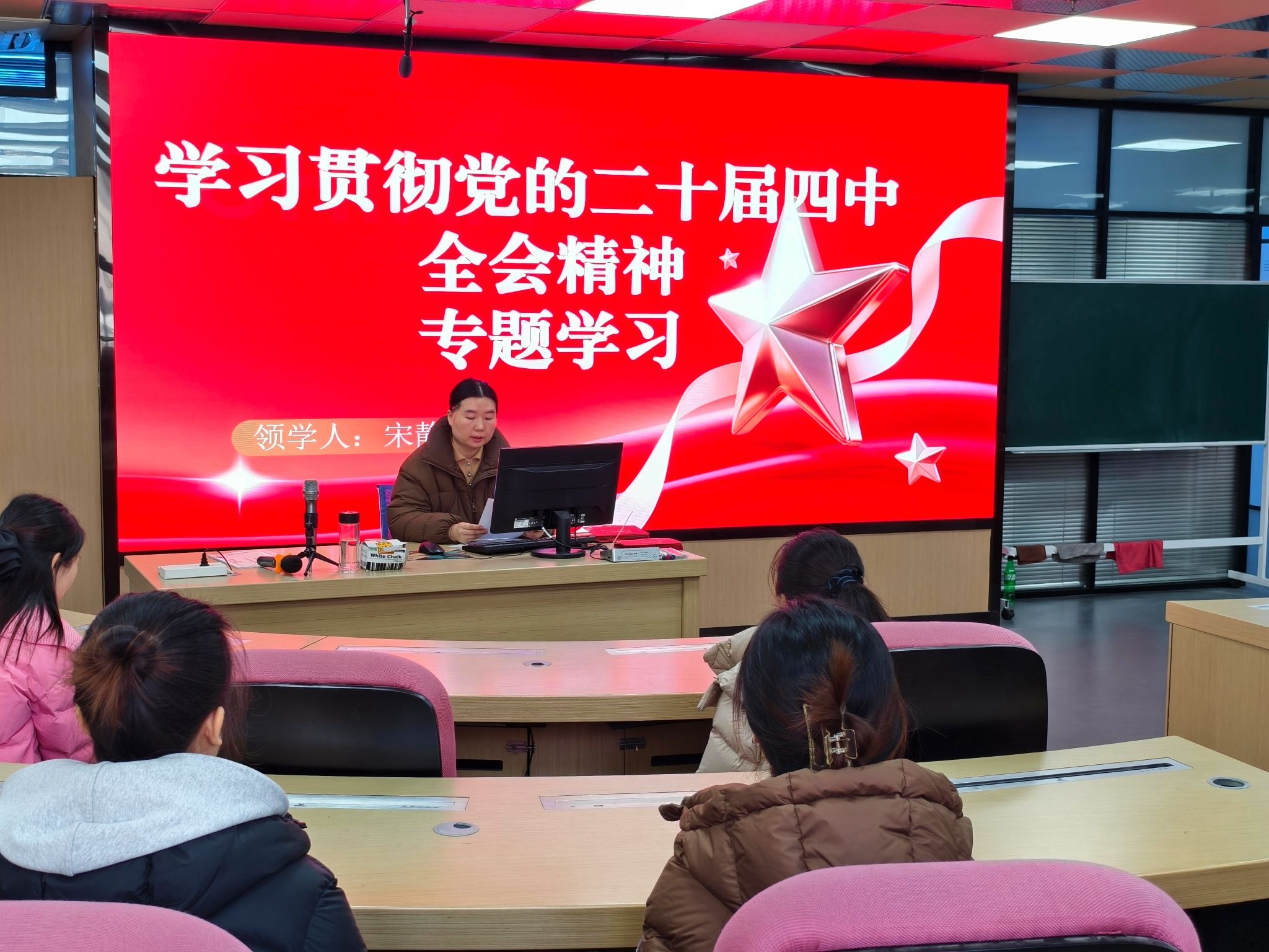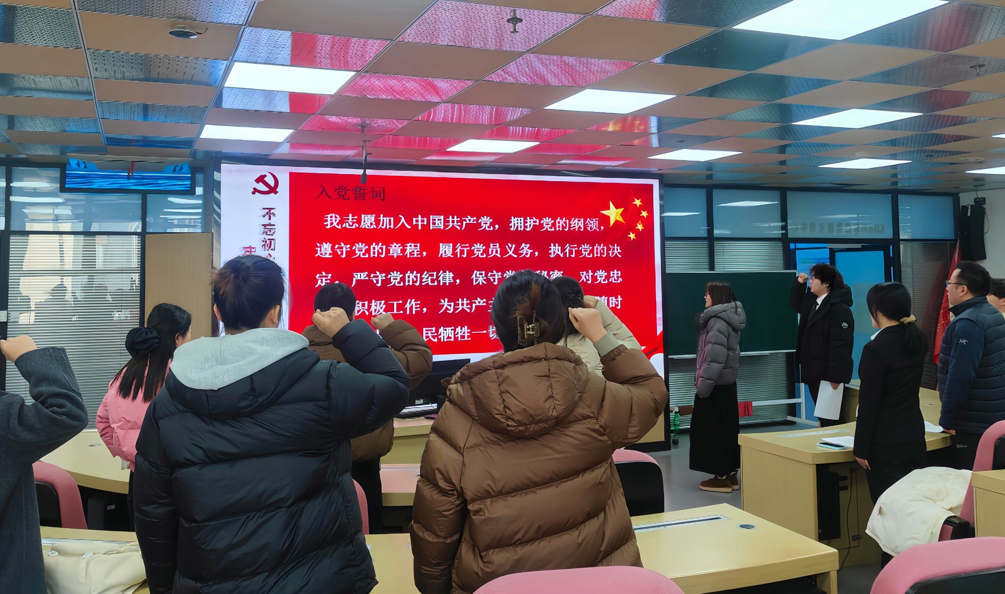 报告会在庄严的重温入党誓词中拉开序幕。全体党员面向鲜红党旗,举起右拳庄严宣誓。铿锵誓言回荡会场,彰显着新时代青年党员对党忠诚、矢志奋斗的坚定信念,为整场活动奠定了庄重而昂扬的基调。