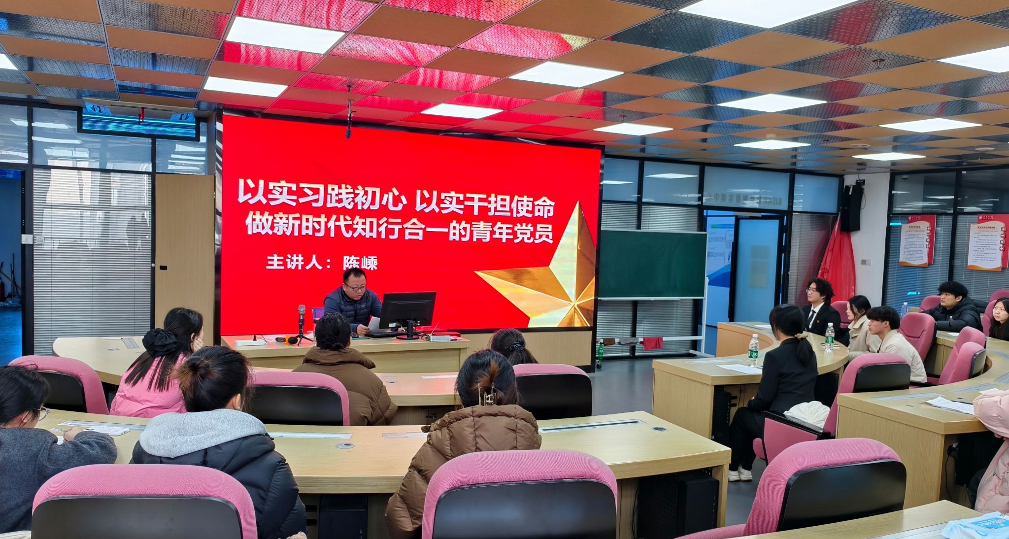 微党课环节,学生科科长陈嵊以《以实习践初心 以实干担使命——做新时代知行合一的青年党员》为题,从坚定理想信念、锤炼过硬本领、主动担当作为、严守纪律底线四个维度,结合专业特色与实践要求,为青年党员指明成长方向,鼓励大家将学习成果转化为实干动力,争做知行合一的新时代青年党员。