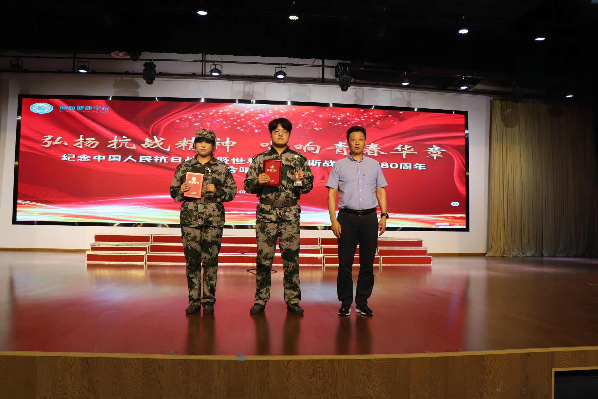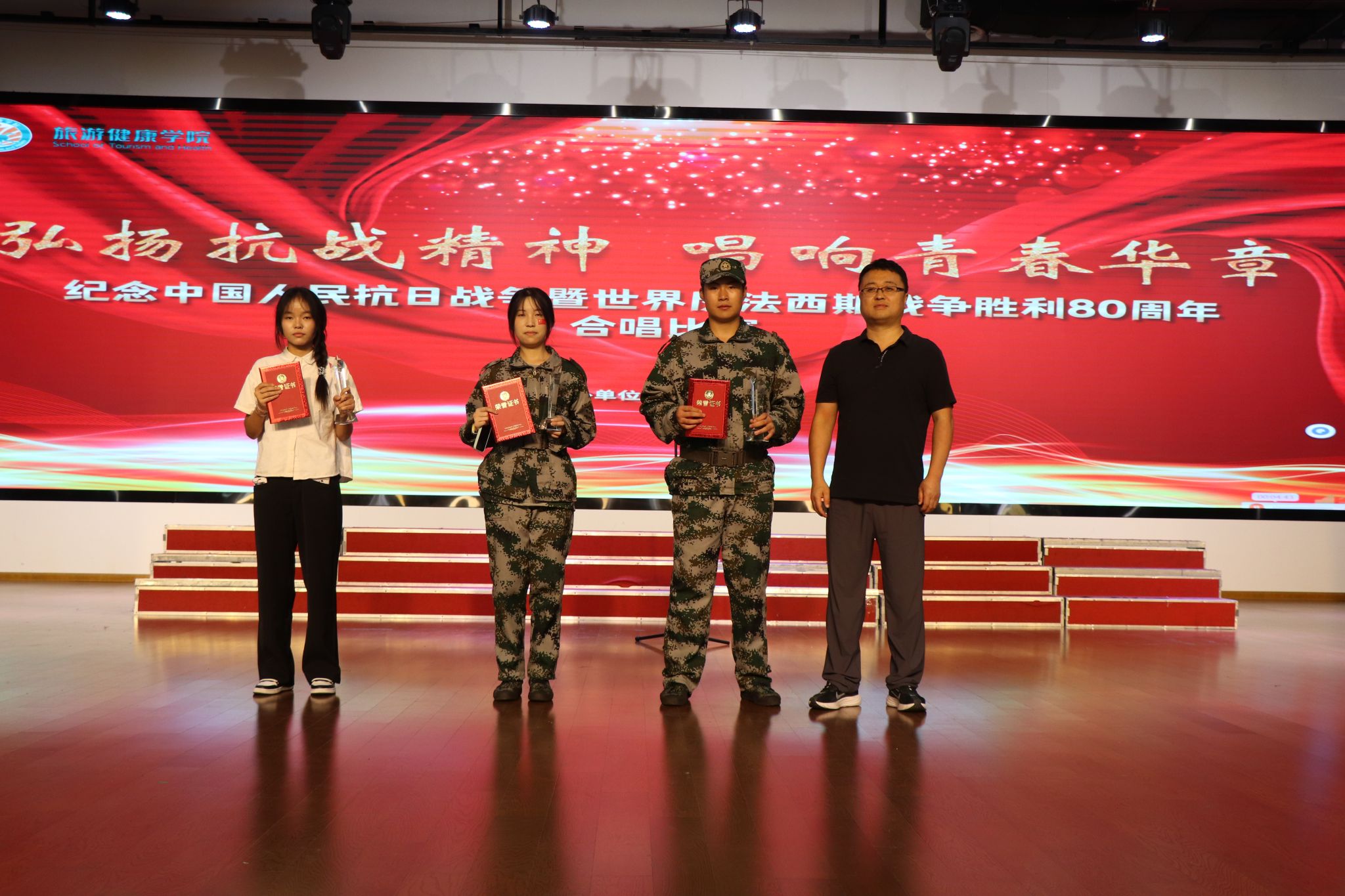 为大力弘扬伟大抗战精神,传承红色基因,凝聚爱国热情,9月29日中午,旅游健康学院在大学生活动中心隆重举办“弘扬抗战精神 唱响青春华章”纪念中国人民抗日战争胜利80周年暨世界反法西斯战争胜利80周年合唱比赛。旅游健康学院院长傅绪明、旅游健康学院副院长王彦龙、旅游健康学院党总支书记杨锐、旅游健康学院党总支副书记刘燕以及全体辅导员和千余名师生代表共同观看演出,通过歌声重温峥嵘岁月,凝聚奋进力量。