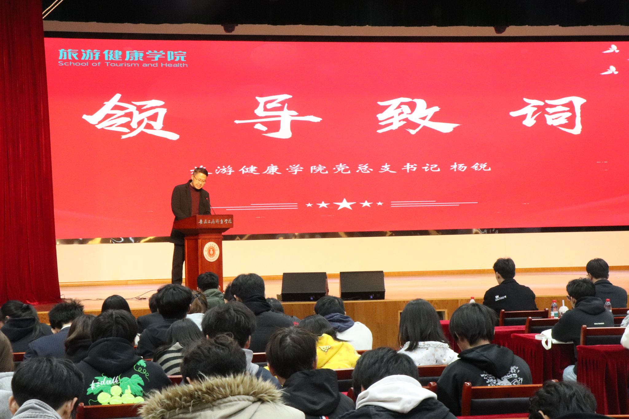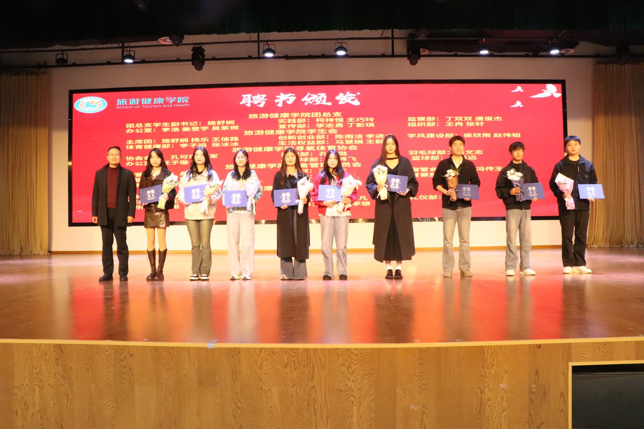 11月12日中午,旅游健康学院在大学生活动中心召开2025年度团学组织换届表彰大会,总结过去一年团学工作成果,表彰先进集体与个人,并完成新一届团学组织骨干的聘任仪式。旅游健康学院党总支书记杨锐、组织员张程程、办公室主任孙群以及团学组织指导老师和辅导员代表出席大会。