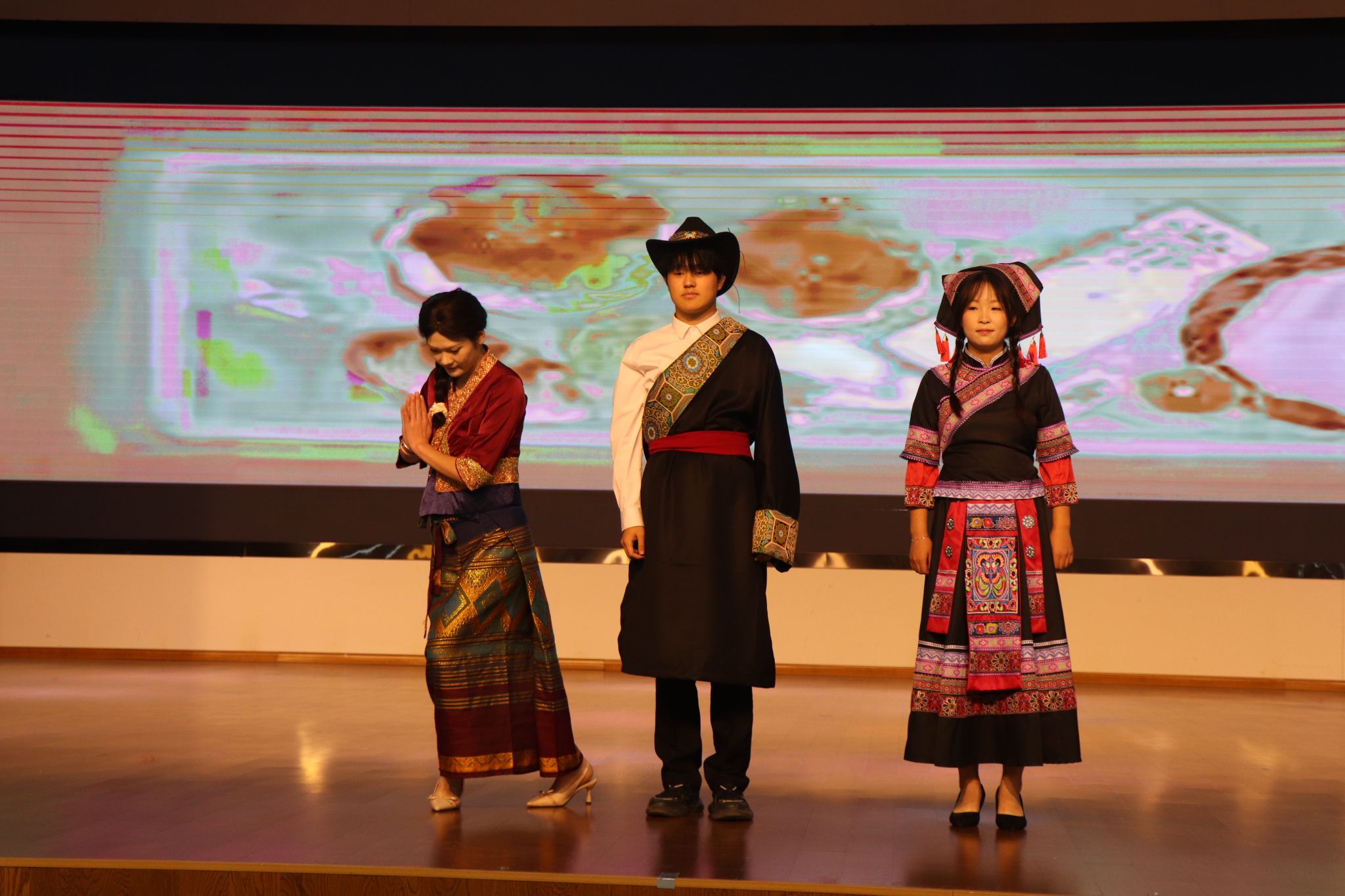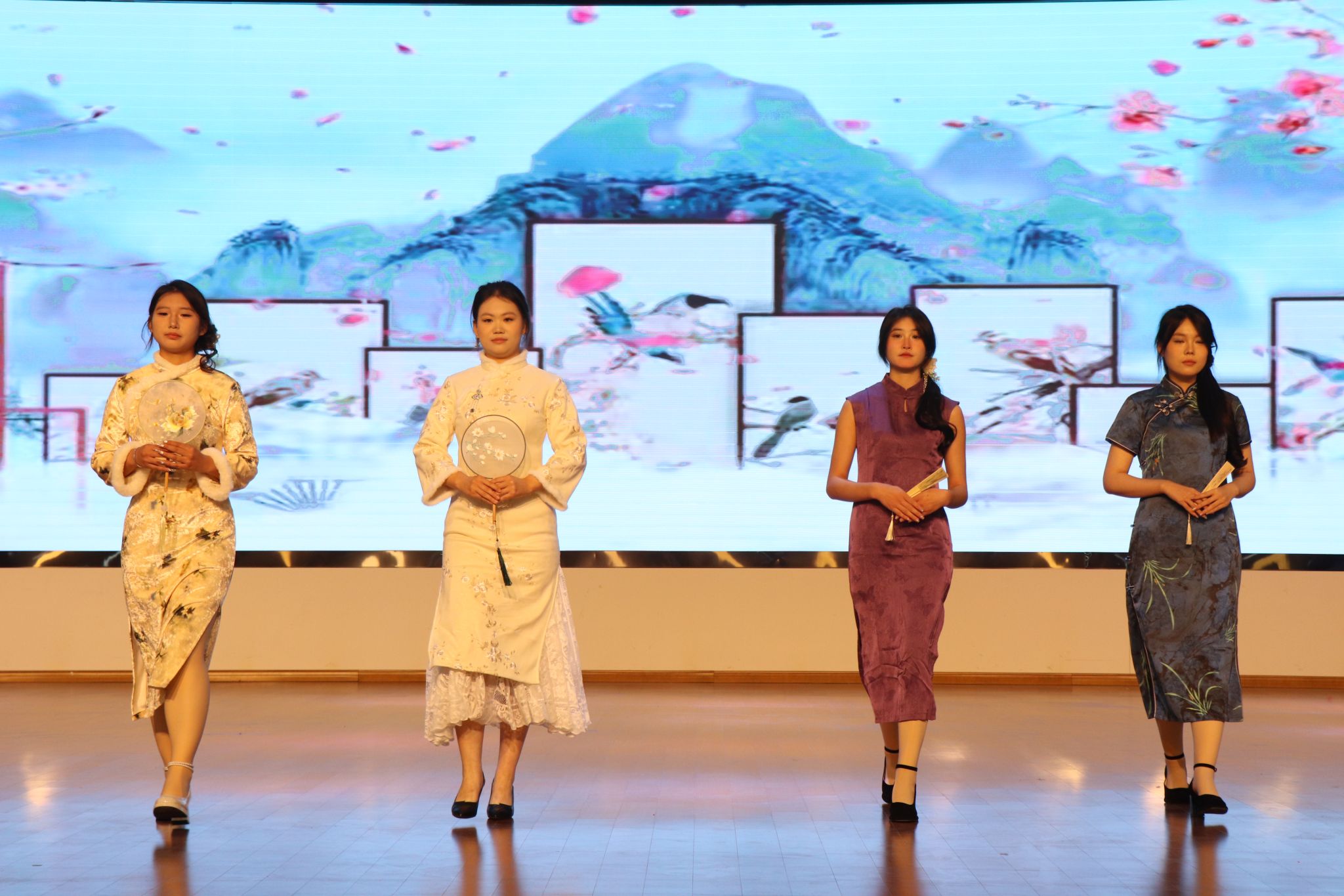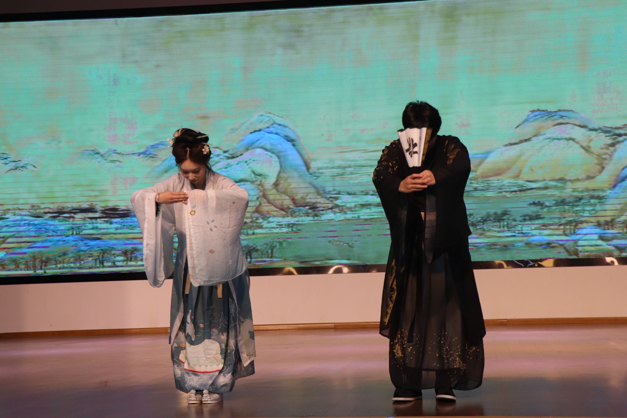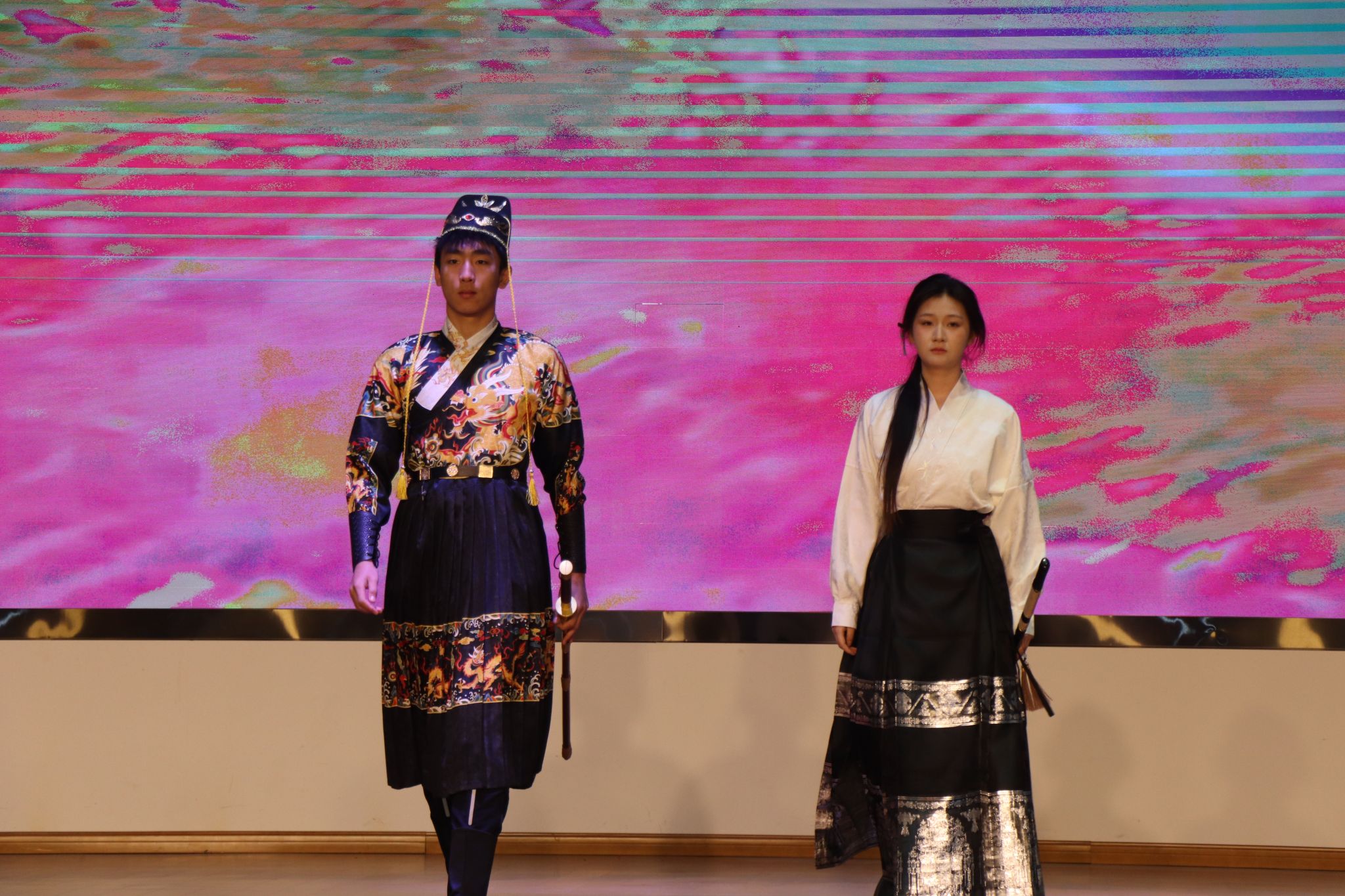 《礼衣华夏》传统服饰文化展演将活动推向高潮。同学们身着秦汉曲裾、盛唐襦裙、明制马面裙,近代旗袍、中山装等以及各少数民族的传统服饰,以“衣冠上国,礼承千年”为核心主题,通过服饰演变、文化符号与时代精神的融合,展现华夏服饰的华美与深邃。同学们还将拱手礼、万福礼等传统礼仪依次呈现,配合解说员对服饰形制与礼仪内涵的讲解,生动呈现中华传统服饰的文明气象。