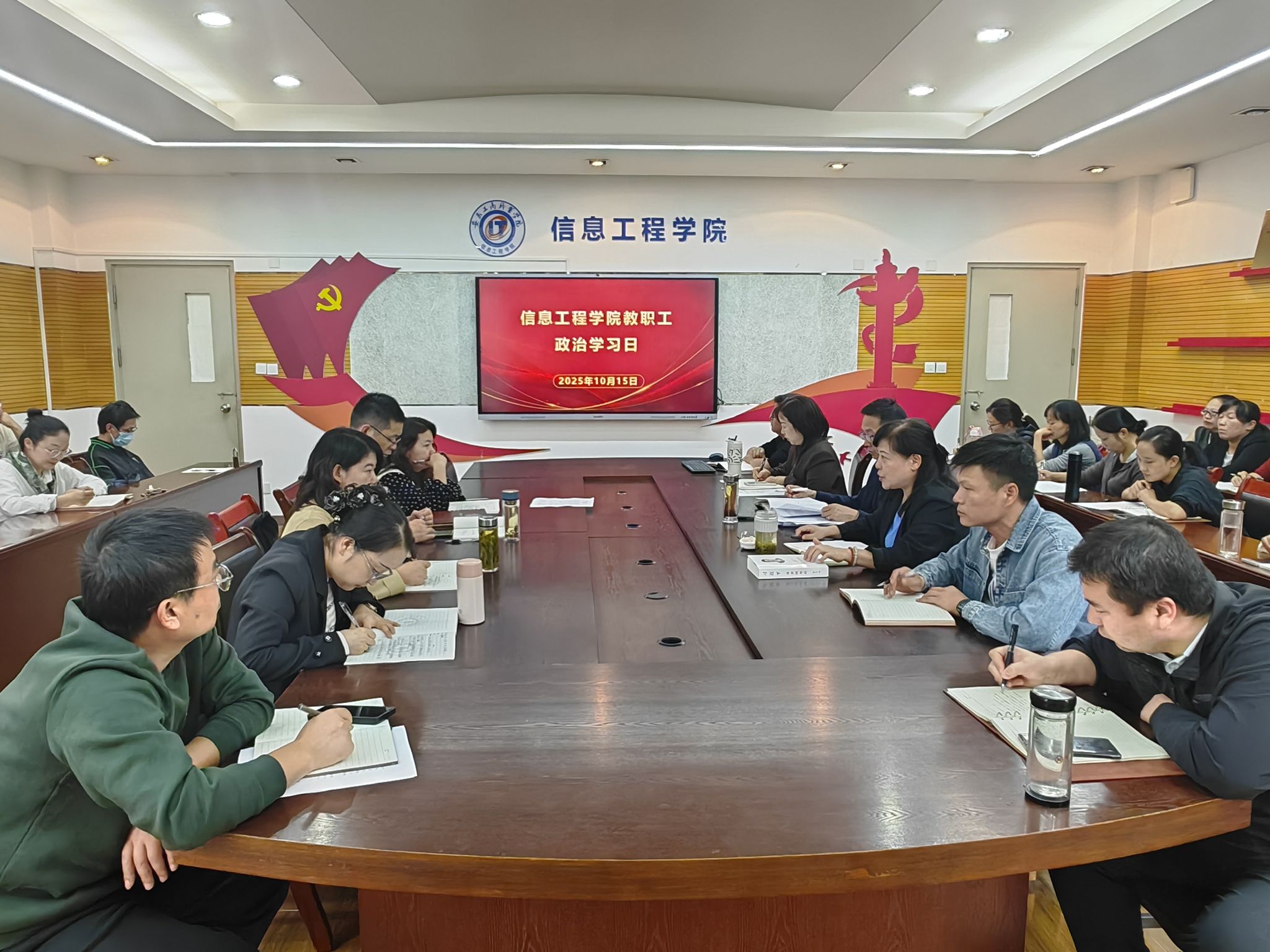 10 月 15 日下午,信息工程学院在学院开展教职工政治学习日活动,集体学习《习近平谈治国理政》第五卷,活动通过视频学习、专题领学、交流发言相结合的形式,深化思想认识,明确工作方向,为学院高质量发展注入思想动力。