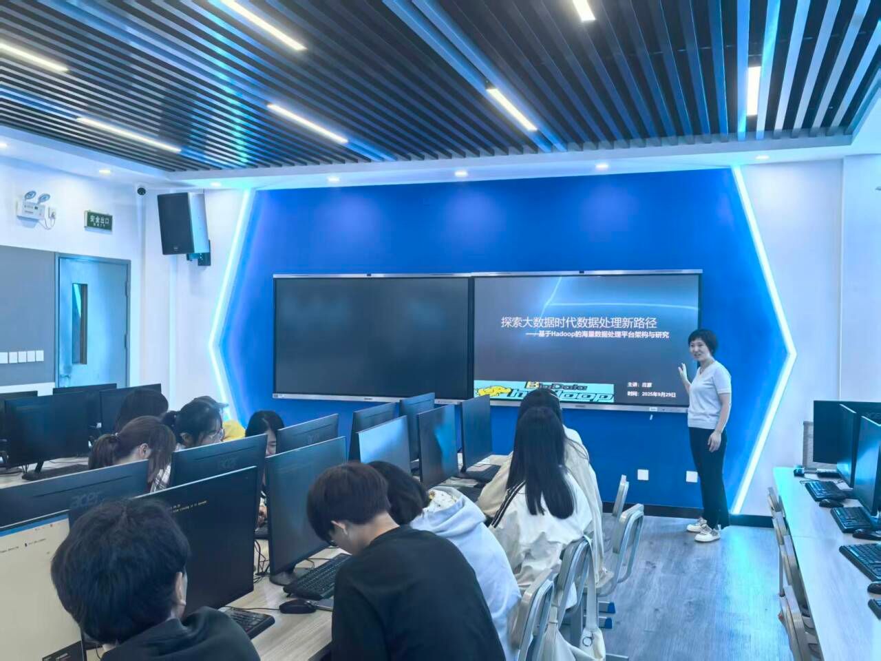 庄彦老师以《探索大数据时代数据处理新路径——基于Hadoop的海量数据处理平台架构与研究》为题,从大数据时代的背景出发,阐述了大数据的特点以及Hadoop平台在数据处理中的核心作用。详细讲解了Hadoop集群的构建过程,包括伪分布式环境的搭建、MapReduce与HDFS等关键技术原理,并结合电商平台数据处理的实际案例,展示了海量数据从采集、处理到服务落地的完整流程。她指出,随着数据量的爆发式增长,传统数据处理方式已难以满足需求,Hadoop凭借其高容错、高扩展的特性,已成为处理海量数据的理想选择。希望同学们能够紧跟技术发展趋势,掌握数据处理的核心能力,为未来的职业发展打下坚实基础。