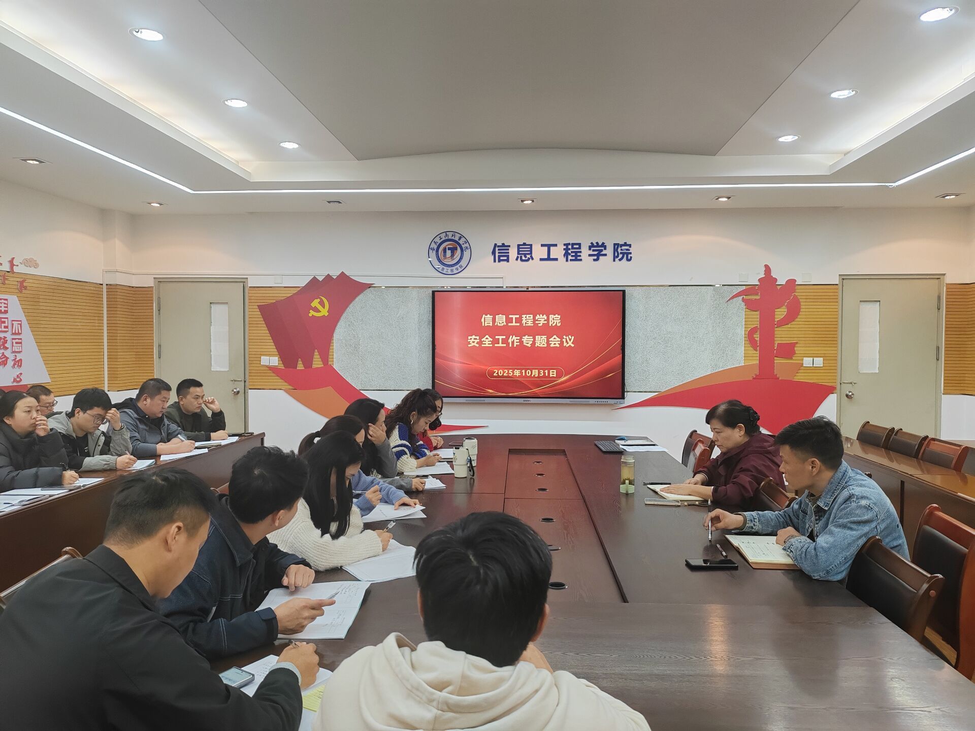 10月31日下午,信息工程学院在307会议室召开全体辅导员工作例会,聚焦校园安全管理与近期学生重点工作展开部署。学院党总支书记张静雯出席会议并讲话,全体辅导员参会,会议由学院党总支副书记陈夺主持。