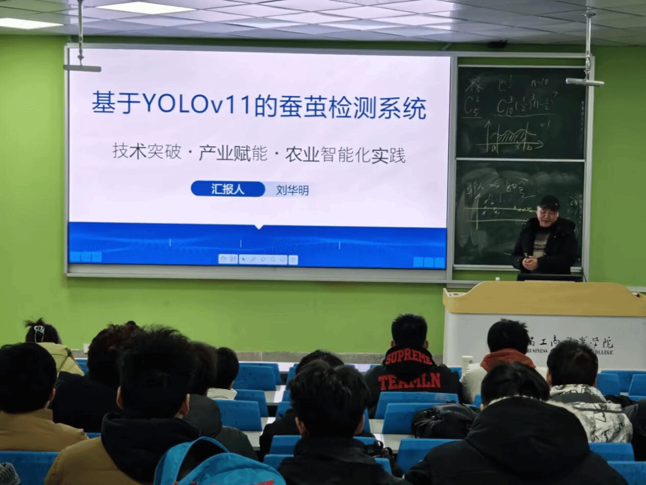 讲座围绕基于 YOLOv11 的蚕茧检测系统,结合实际应用场景,介绍了人工智能技术在农业领域中的典型应用。刘华明教授指出,在桑蚕产业智能化转型背景下,传统人工分拣模式在效率和准确性方面已难以满足产业发展需求,引入目标检测等人工智能技术是实现产业升级的重要方向。在专题讲座上,刘华明教授以清晰的逻辑框架剖析了人工智能技术从理论模型到产业实际落地的完整链路,让在场学生能够直观领会算法与产业发展的深度关联,清晰理解“算法如何服务产业”的内在逻辑。